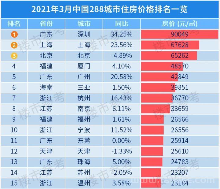 2020年新冠疫情期间,全球央行通过开闸放水提振经济,大量避险资金流入深圳。据中国房地产业数据研究院公布的2021年3月全国288个城市最新楼价显示,深圳最新的楼价已经达到9万元/㎡,同比去年下跌34.25%。