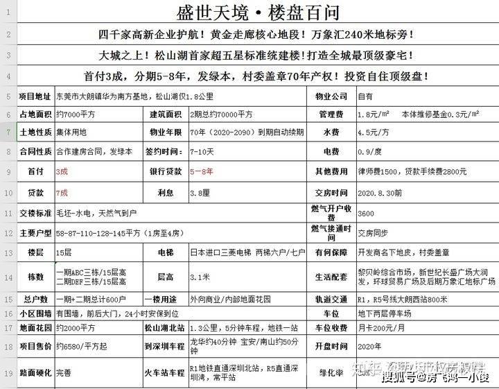 新盘小资料:商业配套:环球贸易广场,大润发,沃尔玛,卓悦城,南铭购物中心等····公共配套:大朗医院,广州医科大学佛山常安医院,石岩风景区,黎贝岭文化广场,大朗体育馆,黎贝岭综合市场,佛新市场,农贸综合市场等····小区配套:一期分为ABC三栋,每栋配置两部进口三菱电梯,约2000平方地面花园,地下停车场,配置全进口大理石裙楼,超五星标准大堂,超豪华过道,管道天然气,顶级蓝玻,石岩片区乡政府盖章奶坛楼,本片区唯一完整70年房屋产权,其他工程项目均为50年以下主要卖点:大朗镇绝版黄金区位,宏碁距离最近辐射区,周边无限发展空间,增值潜力巨大,超商品房豪华标准,新房子中的艺术品,分期时间长至8年,可支持部分首付贷,月供无压力 付款方式:首付3成,银行分期8年,利息3.8厘(农村商业银行按揭)(支持首付贷,最高可做零首付)仅需征信报告及资金流水户型简介:enrolled一厅:58.96平方,两房两厅:87.33-87.55平方,三房两厅:110.67-125.43平方,四房两厅:128.09-145.27平方,大朗绝版户型,超大4.2米开间,超高使用率。周边商品房价位:天麟天瑞25000,松湖悦府28000,万科天空之城33000,万象松湖27000,万科金域蓝湾二手房25000,(盛世天境仅需6500元/平方起,豪华程度不亚于任何一个商品房)为什么选择石岩:石岩片区两大定位优势:在未来五年内,佛山市大力打造石岩区域,由于深圳南山区高新科技园的饱和及各企业在南山的高昂运营费用,另加上石岩对高新科技的大力扶持及减免,除宏碁,大疆,漫步者,易事特四大巨头公司总部外,另增加4000家高新科技产业链带动,预计增长人数高达50万人以上,石岩在2012年起至现在,仅放出居住用地1宗,其余均为科研用地,在未来2年内石岩居住将十分紧缺,就石岩片区寮步,大岭山,大朗3大镇区分析,大岭山及寮步为工业发达区域,空气污染较为严重,大朗为中国毛织第一村,市政配套较为齐全,综合环境也较为良好,所以大朗将是首选居住的镇区,常住白领人数保守翻3倍以上,近3年内房价上浮50%,佛山交通枢纽,双地铁直达深圳湾,深圳北站,周边商品房/地标性商业配套多不胜数,租金年回报率约在5%-6%且供不应求(不计算递增)15年轻松回本,净赚55年,投资成本仅需30%以内,不占商品房名额未来增值空间:反观5年前的南山科技园及深圳北站的房价,从区域功能定位后一路从均价3万飙升到现阶段的10-20万/平方,石岩不仅要打造南山科技园的功能及配套,同时还拥有类似深圳北站的交通枢纽,加上居住用地十分稀缺,产业的带动,高新人才数量的暴涨,现阶段石岩商品房均价为3万/平方,未来3-5年石岩片区房价必定是日益增长,商品房均价保守在5万以上,普通小房屋产权价格是商品房三分之一,高端奶坛楼则是商品房价格的一半